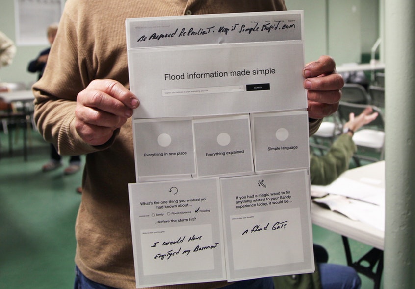 Για να σχεδιάσει λύσεις με τους ιδιοκτήτες κατοικίας, η IDEO δημιούργησε σταθμούς για συναντήσεις στο Canarsie, Red Hook και Gerritsen Beach και έβαλε κατοίκους που είχαν πληγεί από πλημμύρες να δημιουργήσουν πρωτότυπα χαρτιού για τους πόρους και τις αναγκαίες λύσεις που θα χρειαζόντουσαν την επόμενη φορά που θα τους χτυπούσε ένας τυφώνας. Η ομάδα έμαθε πώς οι κάτοικοι περιγράφουν το ατομικό τους κίνδυνο, σε ποιες πληροφορίες δίνουν προτεραιότητα και πώς η απογοήτευσή τους θα μπορούσε να αποτελέσει αφορμή για ένα καλύτερο αποτέλεσμα. Στο Κάτω Μανχάταν, όπου οι κάτοικοι έχουν λιγότερη επίγνωση του κινδύνου πλημμύρας, η ομάδα δημιούργησε έναν αναδυόμενο σταθμό με θεατές εικονικής πραγματικότητας, οι οποίοι μίλησαν για το νερό που έτρεχε στους γύρω δρόμους.